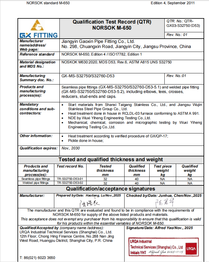 Vi er glade for å dele at selskapet vårt har oppnådd NORSOK M650-sertifiseringen for fem viktige korrosjonsbestandige legeringskvaliteter: S32205, S31803, S32750, S32760 og S31254.